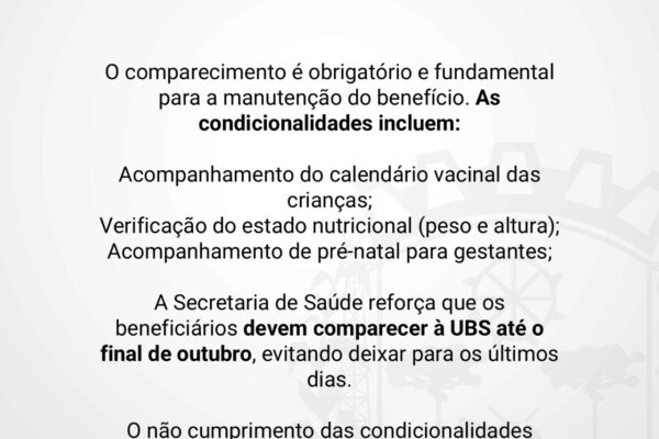 A Prefeitura de Xanxerê informa, aos beneficiários do Bolsa Família, que compareçam à Unidade Básica de Saúde (UBS) de sua área para o cumprimento das condicionalidades de saúde exigidas pelo programa.