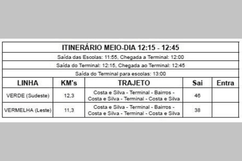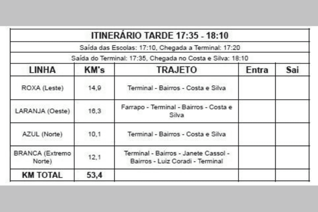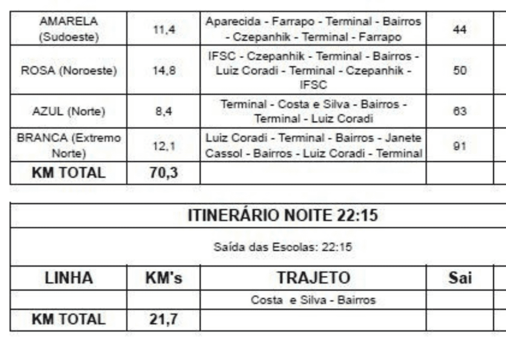 Já no final da tarde, a saída acontece às 17h35, com retorno às 18h20. À noite, o serviço conta com um horário específico, às 22h15, com saída da EEB Costa e Silva, voltado principalmente aos estudantes do período noturno.